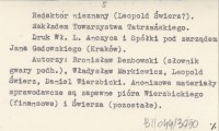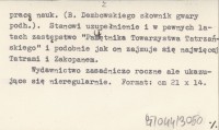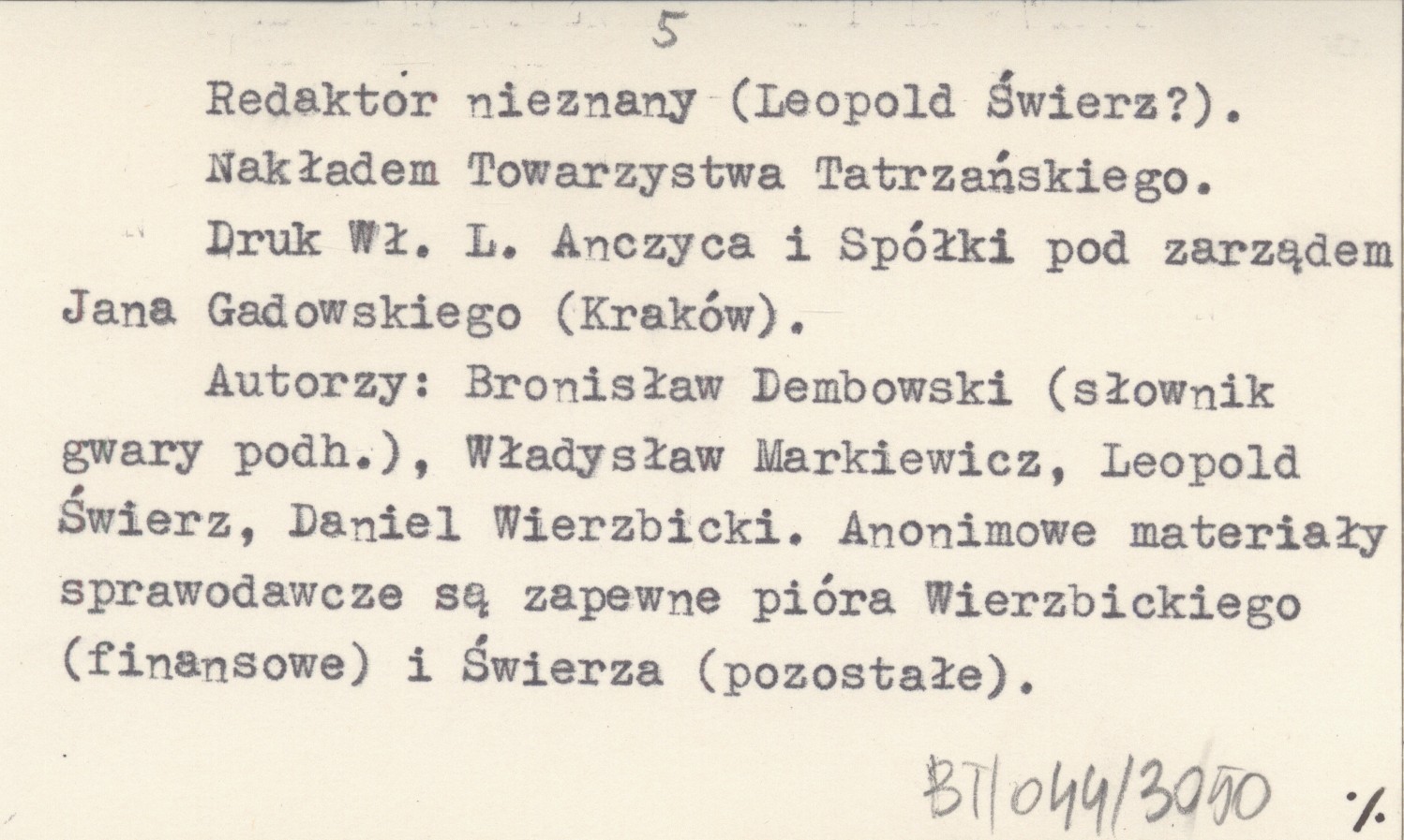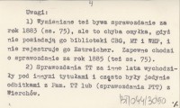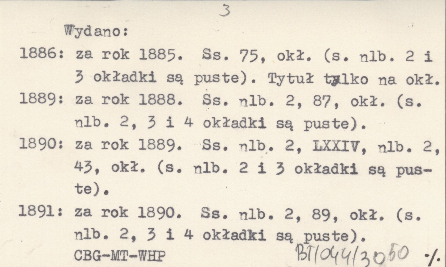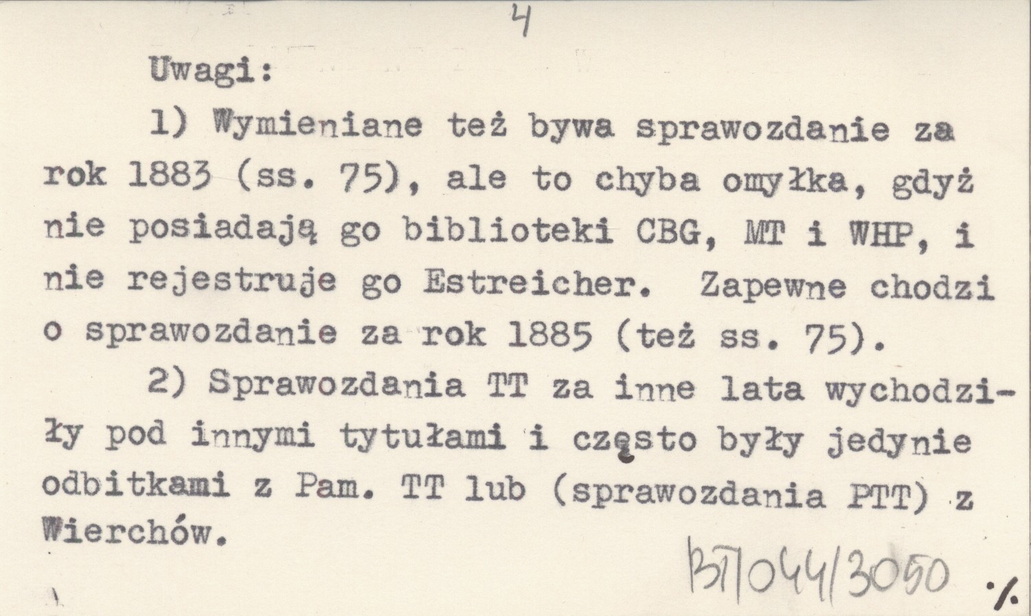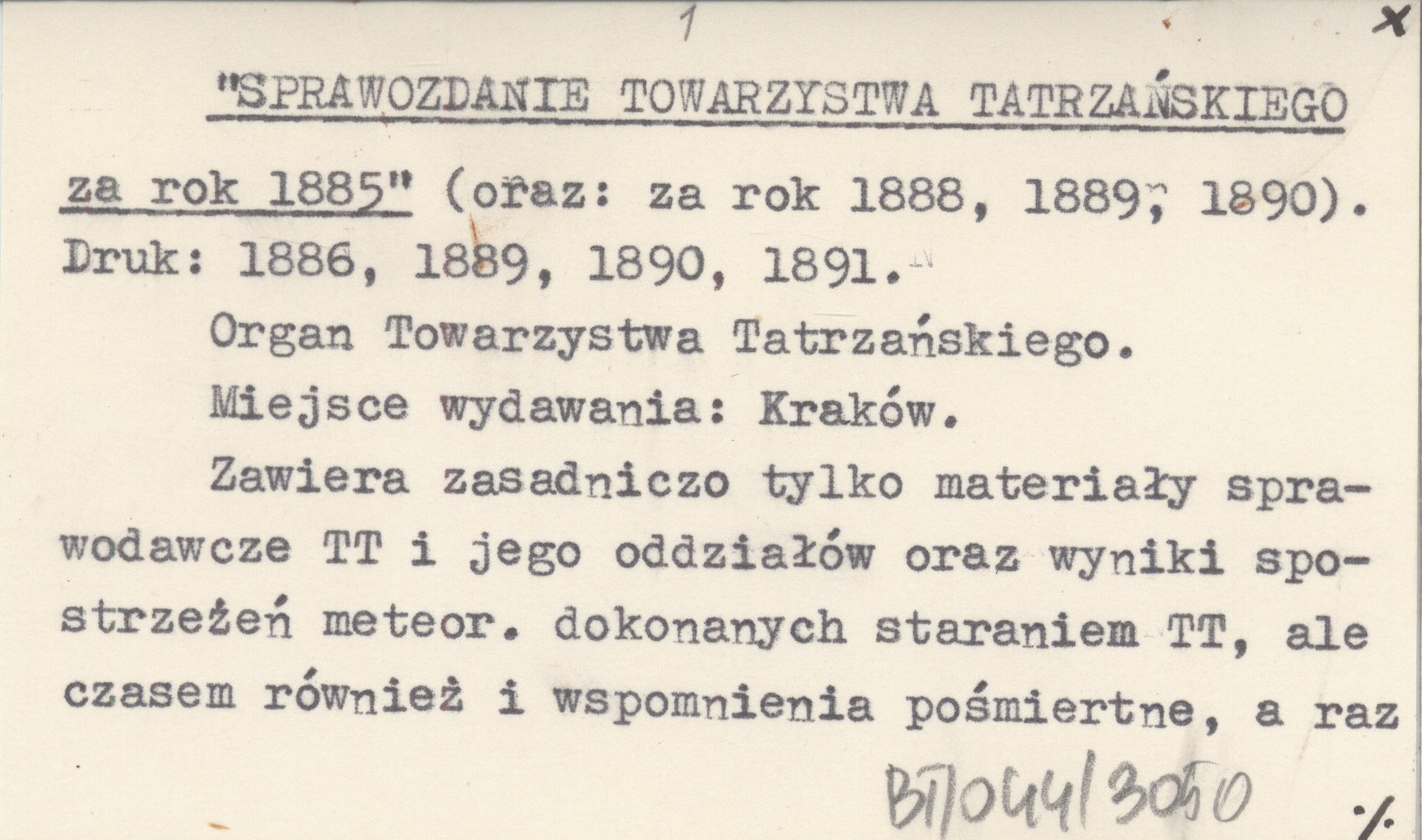 Sprawozdanie Towarzystwa Tatrzańskiego (Kraków) , 1886 (1885), 75 s., okł. ; 1889 (1888), [2], 87 s., okł. ; 1890 (1889), [2], LXXIV, [2], 43 s., okł. ; 1891 (1890), [2], 89 s., okł. ; 21x14 cm. Organ Towarzystwa Tatrzańskiego. Zawiera zasadniczo tylko materiały sprawodawcze TT i jego oddziałów oraz wyniki spostrzeżeń meteorologicznych dokonanych staraniem TT, ale czasem, również i wspomnienia pośmiertne, a raz pracę naukową (B. Dembowskiego słownik gwary podhalańskiej). Stanowi uzupełnienie i w pewnych latach zastępstwo "Pamiętnika Towarzystwa Tatrzańskiego" i podobnie jak on zajmuje się najwięcej Tatrami i Zakopanem. Za rok 1885, 1888, 1889, 1890. Druk: 1886, 1889, 1890, 1891. Wydawnictwo zasadniczo roczne ale ukazujące się nieregularne. 1). Wymienione też bywa sprawozdanie za rok 1883 (75 s.), ale to chyba omyłka, gdyż nie posiadają go biblioteki CBG, MT i WHP, i nie rejestruje go Estreicher. Zapewne chodzi o sprawozdanie za rok 1885 (też 75 s.). 2) Sprawozdania TT za inne lata wychodziły pod innymi tytułami i często były jedynie odbitkami z Pam. TT lub (sprawozdania PTT) z Wierchów. Redaktor nieznany (Leopold Świerz?). Nakładem Towarzystwa Tatrzańskiego. Druk Wł. L. anczyca i Spółki pod zarządem Jana Gadowskiego (Kraków). Autorzy: Bronisław Dembowski (słownik gwary podhalańskiej), Władysław Markiewicz, Leopold Świerz, Daniel Wierzbicki, Anonimowe materiały sprawozdawcze są zapewne pióra Wierzbickiego (finansowe) i Świerza (pozostałe). REC: MAŁACHOWSKI B. (jego zestawienie tu omówionych i innych sprawozdań TT i PTT jest częściowo błędne).