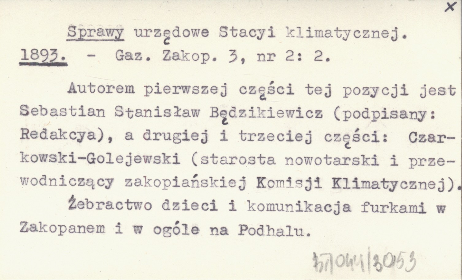 Gazeta Zakopiańska, 3, nr 2: 2. Żebractwo dzieci i komunikacja furkami w Zakopanem i w ogóle na Podhalu. Autorem pierwszej części tej pozycji jest Sebastian Stanisław Będzikiewicz (podpisany: Redakcya), a drugiej i trzeciej części: Czarkowski-Golejewski (starosta nowotarski i przewodniczący zakopiańskiej Komisji Klimatycznej).