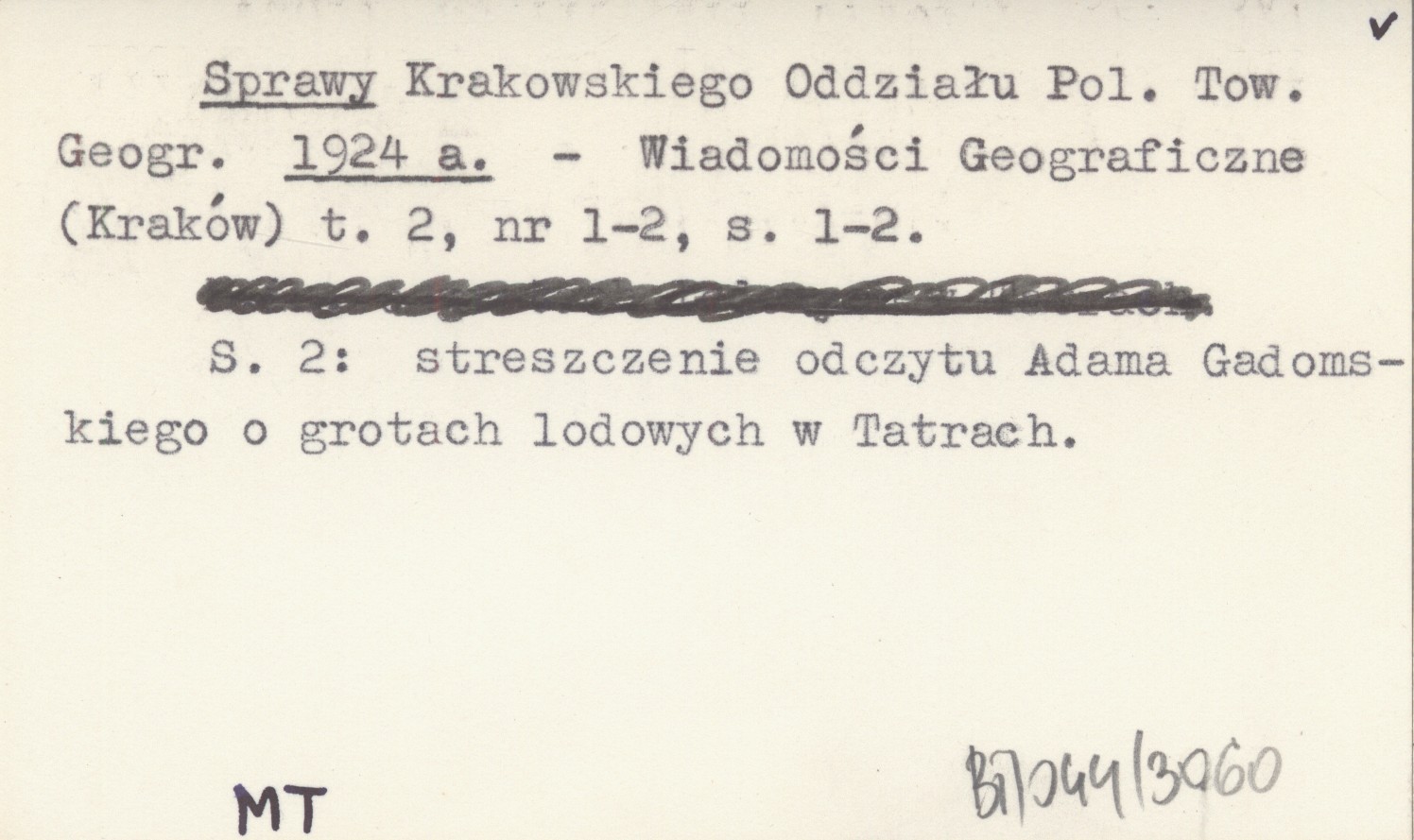 Wiadomości Geograficzne (Kraków) , T. 2, nr 1-2: 1-2. S. 2: streszczenie odczytu Adama Gadomskiego o grotach lodowych w Tatrach.