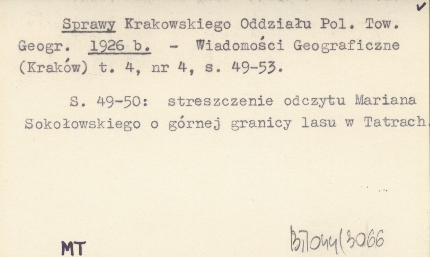 Wiadomości Geograficzne (Kraków) , T. 4, nr 4: 49-53. S. 49-50: streszczenie odczytu Mariana Sokołowskiego o górnej granicy lasu w Tatrach.