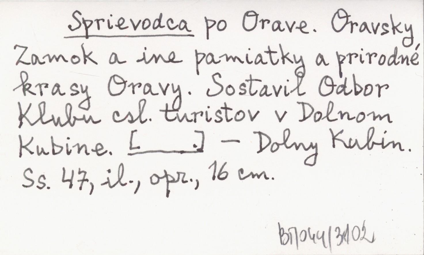 Sprievodca po Orave. Oravsky Zamok a ine pamiatky a prirodné krasy Oravy. Sostavil Odbor Klubu csl. turistov v Dolnom Kubine.