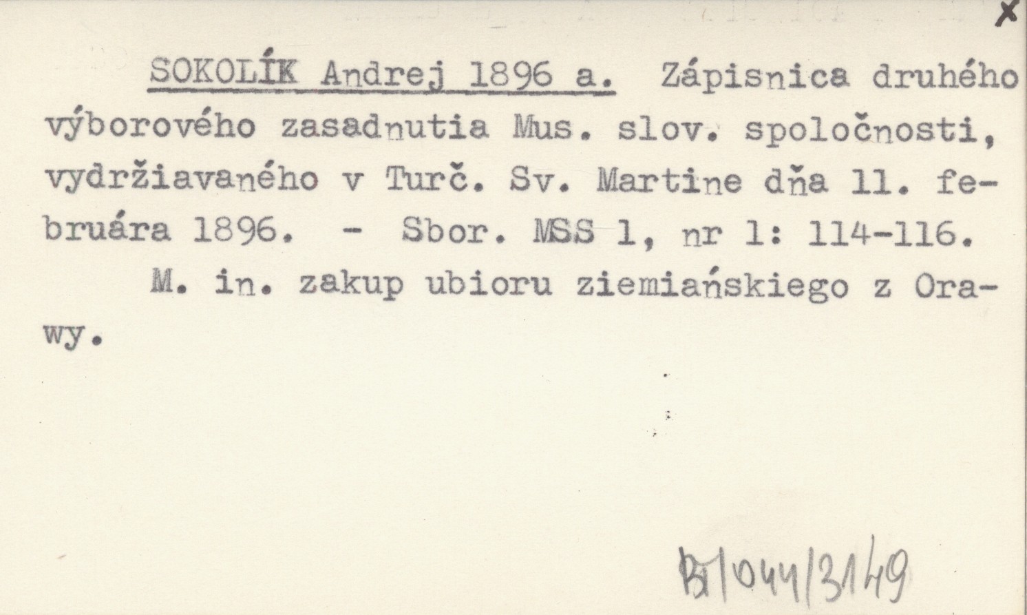 SOKOLÍK Andrej 1896 a Zápisnica druhého výborového zasadnutia Mus. slov. spoločnosti, vydrľiavaného v Turč. Sv. Martine dňa 11. februára 1896.