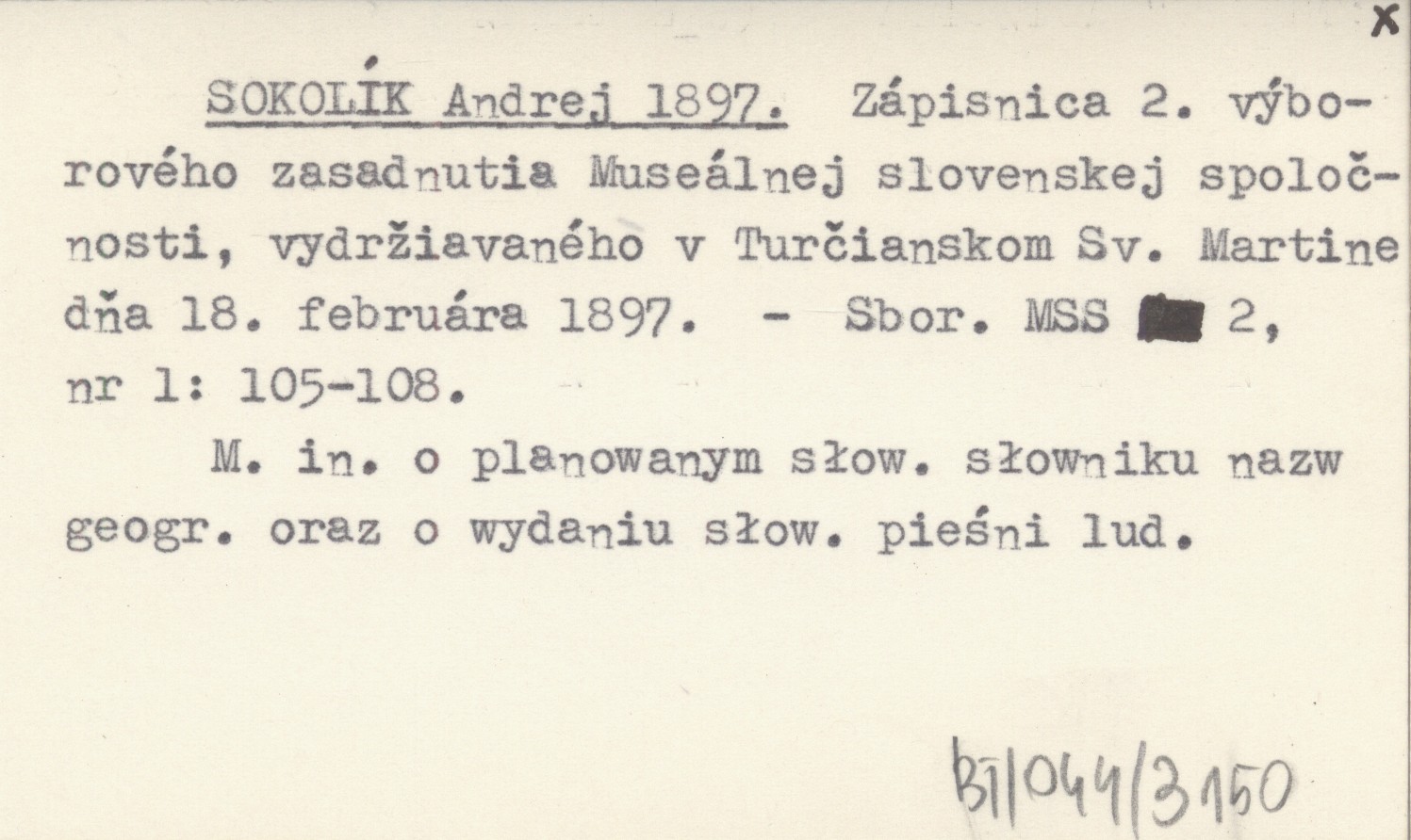SOKOLÍK Andrej 1897 Zápisnica 2. druhého výborového zasadnutia Museálnej slovenskej spoločnosti, vydržiavaného v Turčianskom Sv. Martine dňa 18. februára 1897.