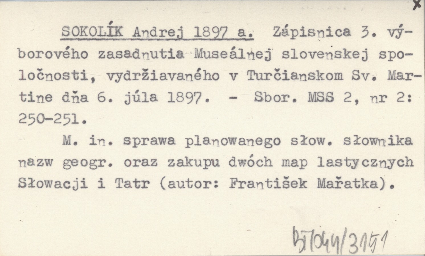 SOKOLÍK Andrej 1897 a Zápisnica 3. druhého výborového zasadnutia Museálnej slovenskej spoločnosti, vydržiavaného v Turčianskom Sv. Martine dňa 6. júla 1897.