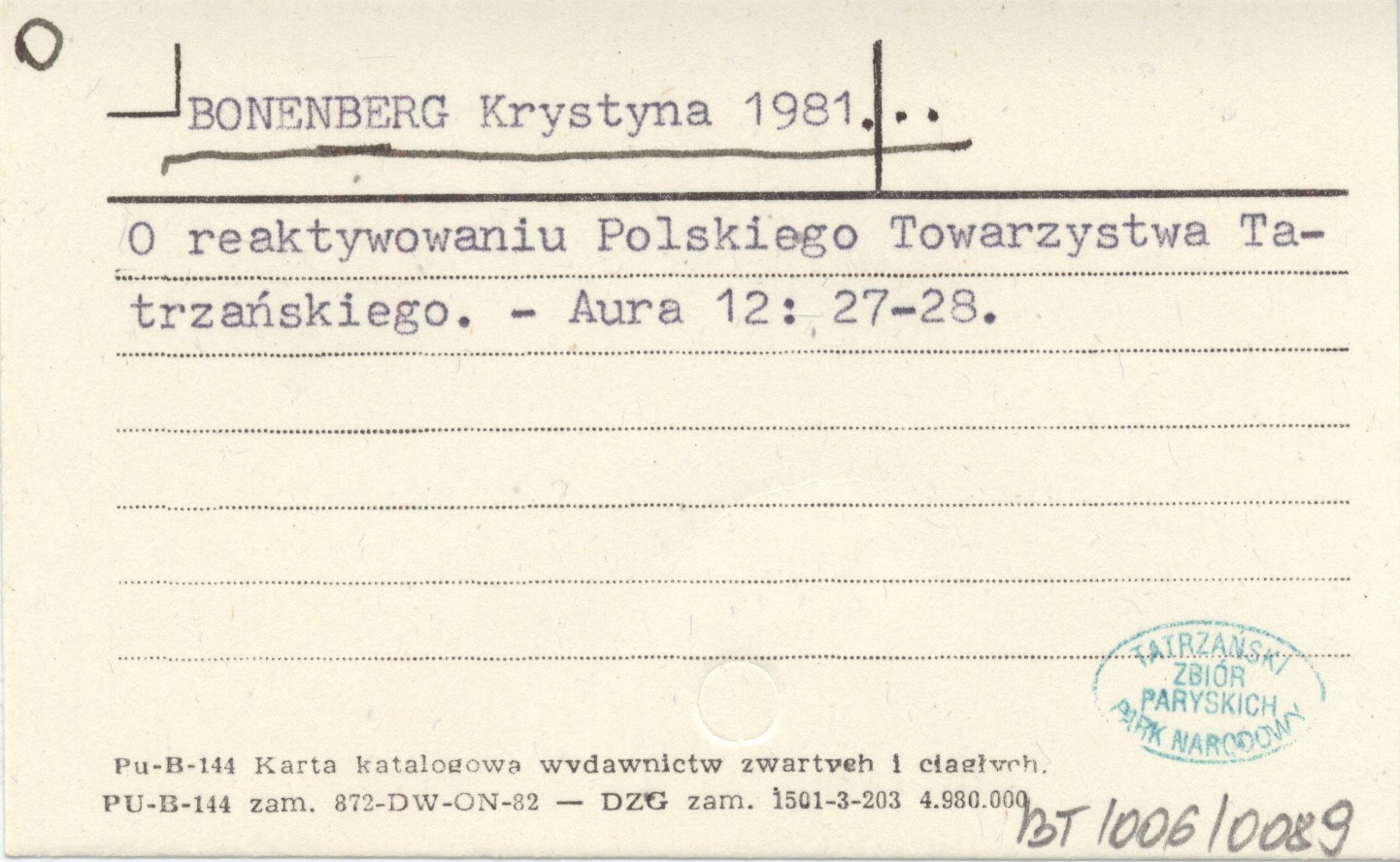 BONENBERG Krystyna 1981 O reaktywowaniu Polskiego Towarzystwa Tatrzańskiego.