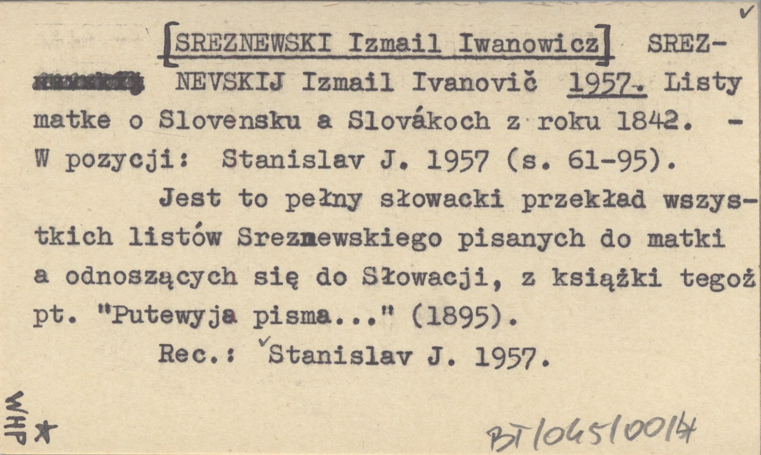 STANISLAV J. 1957 , S. 61-95. Jest to pełny słowacki przekład wszystkich listów Sreznewskiego pisanych do matki a odnoszących się do Słowacji, z książki tegoż pt. "Putewyja pisma..." (1895). REC: STANISLAV J. 1957