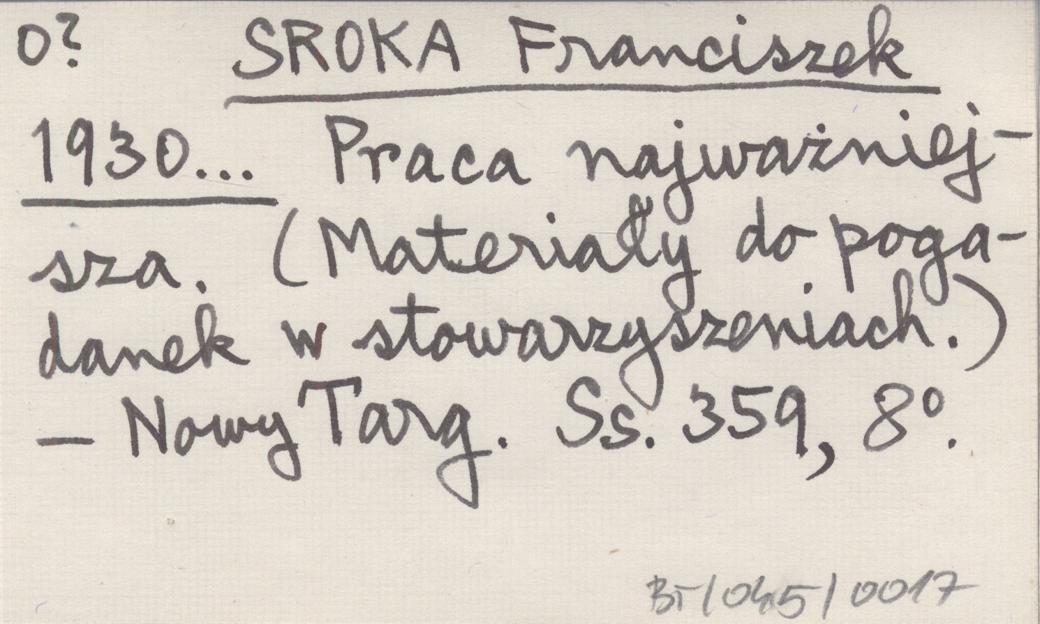 SROKA Franciszek 1930... Praca najważniejsza. (Materiały do pogadanek w stowarzyszeniach).