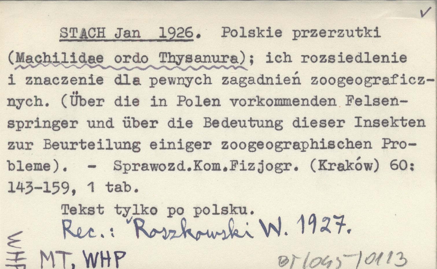 STACH Jan 1926 Polskie przerzutki (Machilidae ordo Thysanura) ; ich rozsiedlenie i znaczenie dla pewnych zagadnień zoogeograficznych. (Über die in Polen vorkommenden Felsenspringer und über die Bedeutung dieser Insekten zur Beurteilung einiger zoogeographischen Probleme).