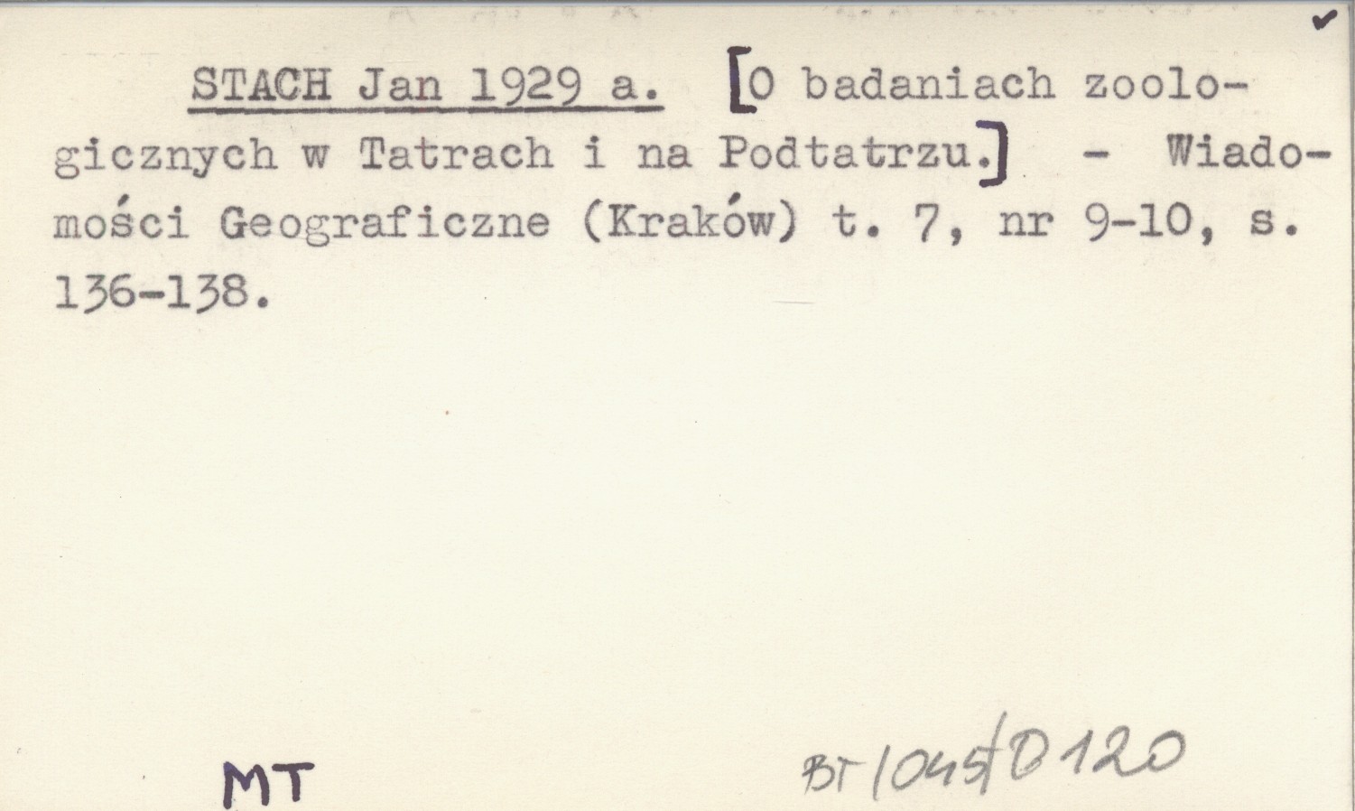 STACH Jan 1929 a [O badaniach zoologicznych w Tatrach i na Podtatrzu.]