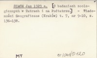 STACH Jan 1929 a [O badaniach zoologicznych w Tatrach i na Podtatrzu.]