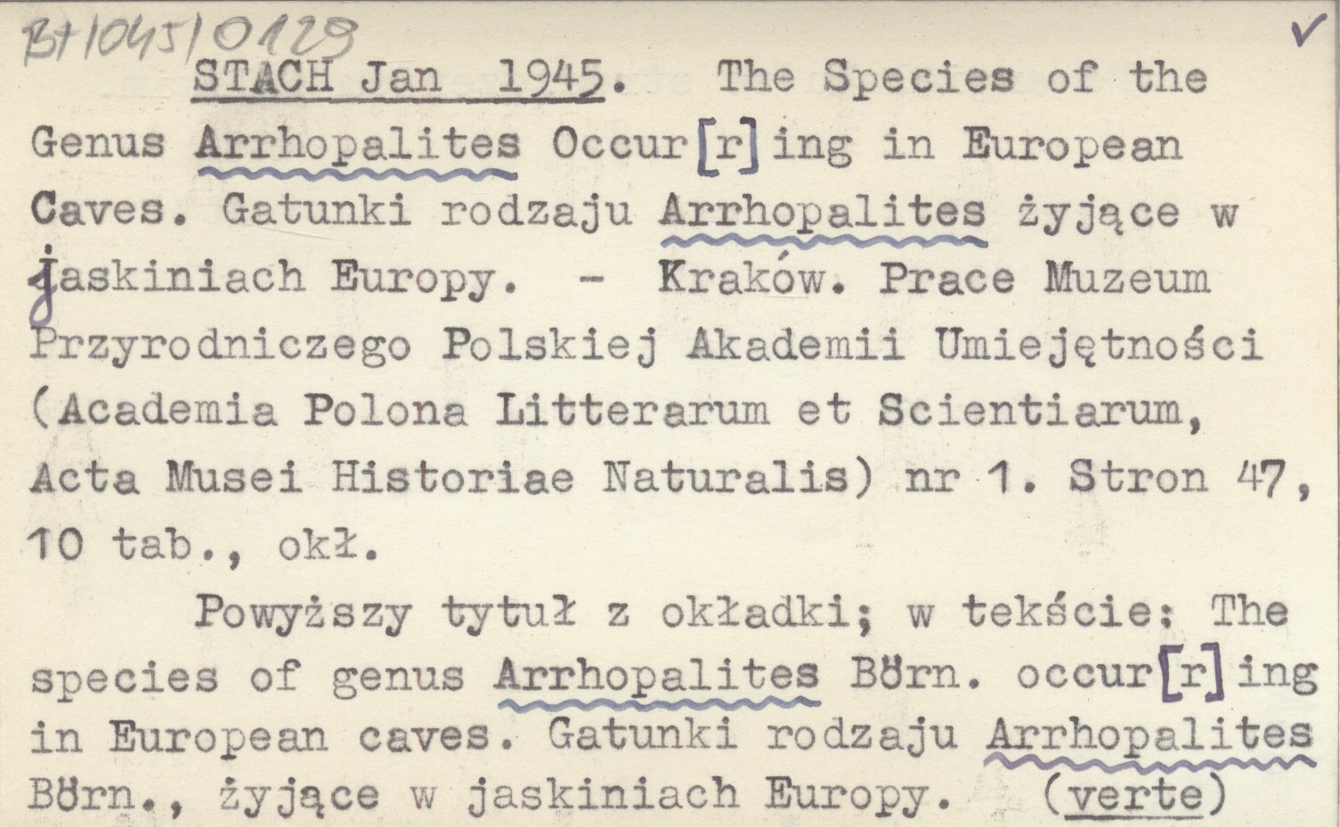 Prace Muzeum Przyrodniczego Polskiej Akademii Umiejętności (Academia Polona Litterarum et Scientiarum, Acta Musei Historiae Naturalis) (Kraków) , Nr 1, 47 s., 10 k., okł. Powyższy tytuł z okładki ; w tekście: The species of genus Arrhopalites Börn. occur[r]ing in European caves. Gatunki rodzaju Arrhopalites Börn., żyjące w jaskiniach Europy. Po angielsku ze streszczeniem polskim.