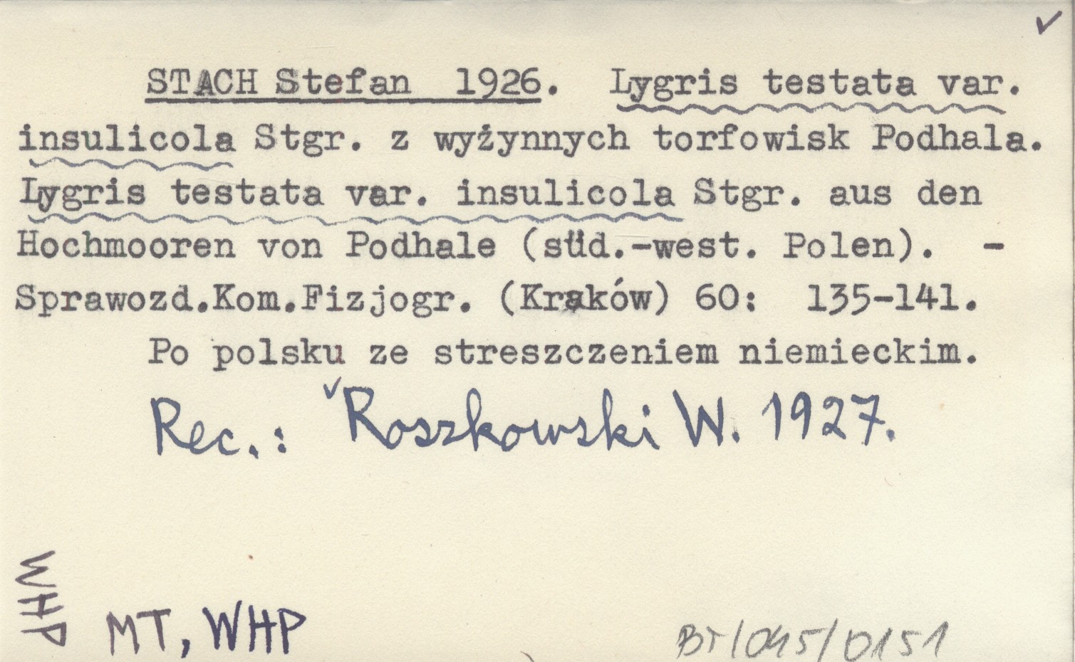 Sprawozdanie Komisji Fizjograficznej (Kraków) , 60: 135-141. Po polsku ze streszczeniem niemieckim. REC: ROSZKOWSKI W. 1927