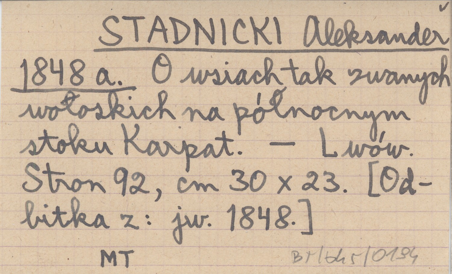 STADNICKI Aleksander 1848 a O wsiach tak zwanych wołoskich na północnym stoku Karpat.