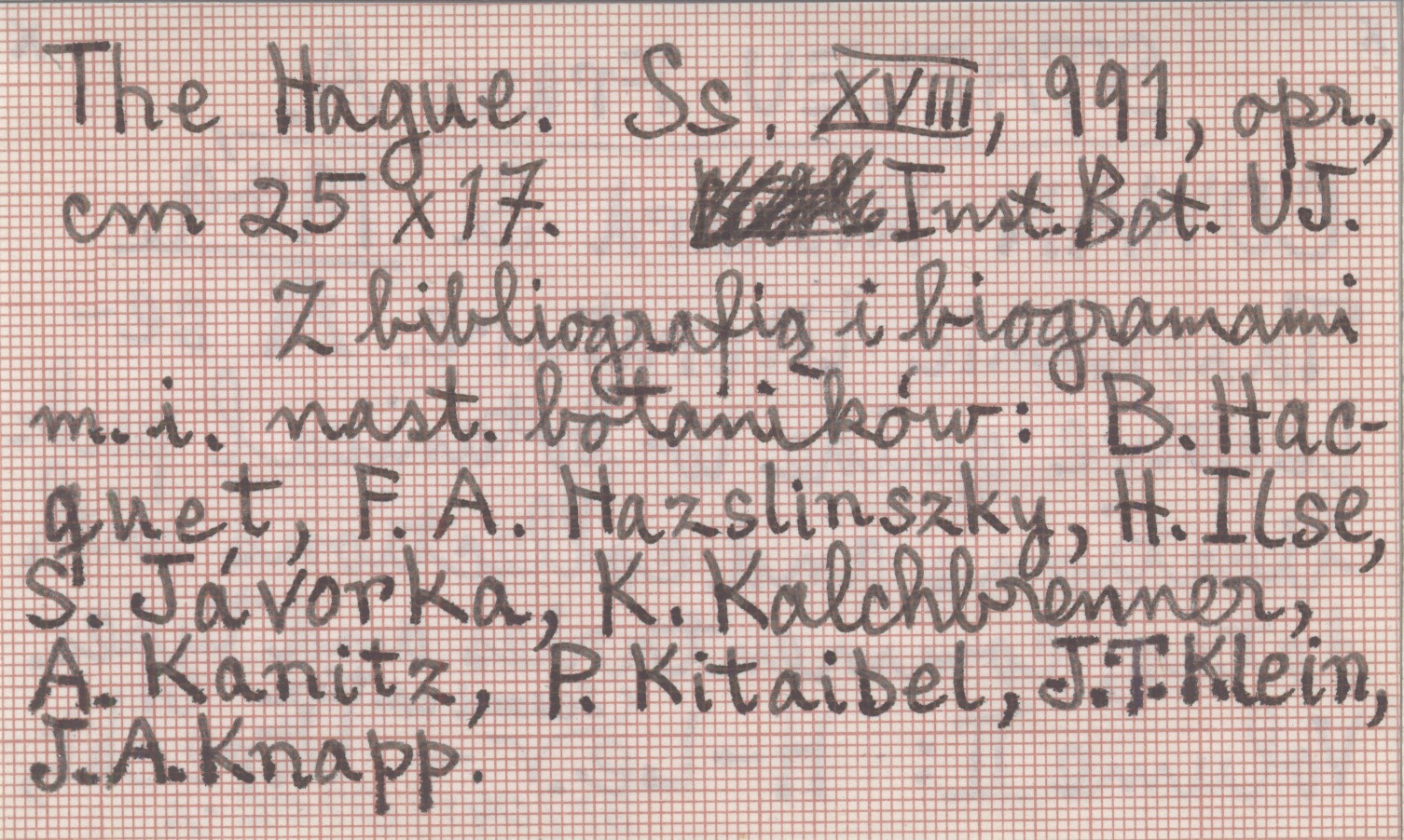 WYD: 2 Utrecht ; The Hague ; , XVIII, 991 s., opr., 25x17 cm. Instytut Botaniki Uniwersytetu Jagiellońskiego. Z bibliografią i biogramami m. in. następujących botaników: B. Hacquet, F. A. Hazslinszky, H. Ilse, S. Jávorka, K. Kalchbrenner, A. Kanitz, P. Kitaibel, J. T. Klein, J. A. Knapp.