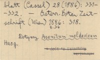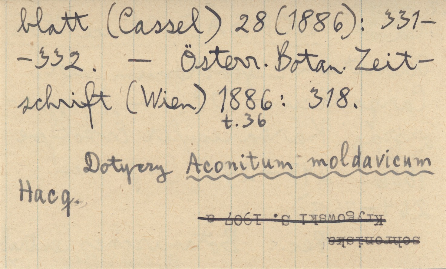 Magyarországi Kárpátegyesület Évkönyve, T. 13: 247-248. Dotyczy Aconitum moldavicum Hacq. I po niem: 264-265. REC: Botanisches Centralblatt (Cassel) 28 (1886): 331-332.- Österreichischen Botanischen Zeitschrift (Wien) t. 36 (1886): 318.