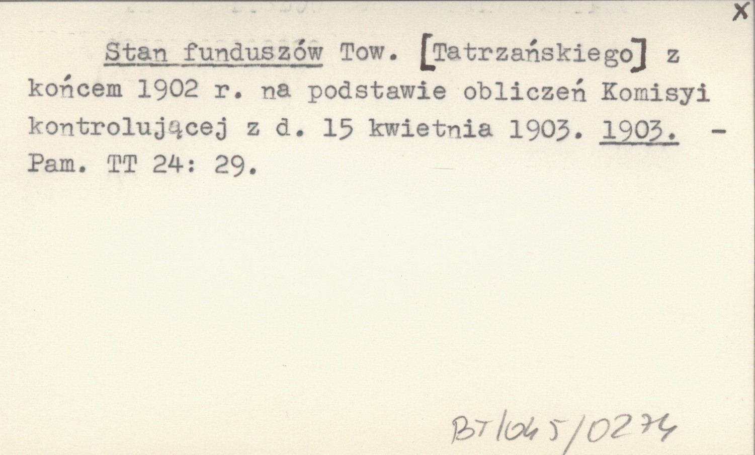 Stan funduszów Tow. [Tatrzańskiego] z końcem 1902 r. na podstawie obliczeń Komisyi kontrolującej z d. 15 kwietnia 1903. 1903
