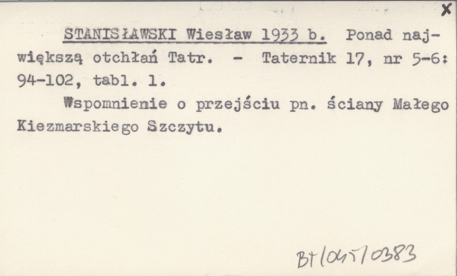Taternik, 17, nr 5-6: 94-102, 1 k. Wspomnienie o przejściu pn. ściany Małego Kiezmarskiego Szczytu.