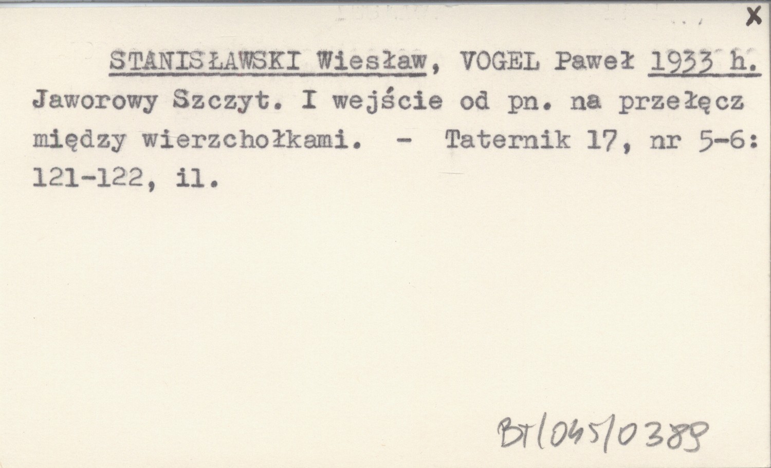 STANISŁAWSKI Wiesław VOGEL, Paweł. ; 1933 h Jaworowy Szczyt. I wejście od pn. na przełęcz między wierzchołkami.