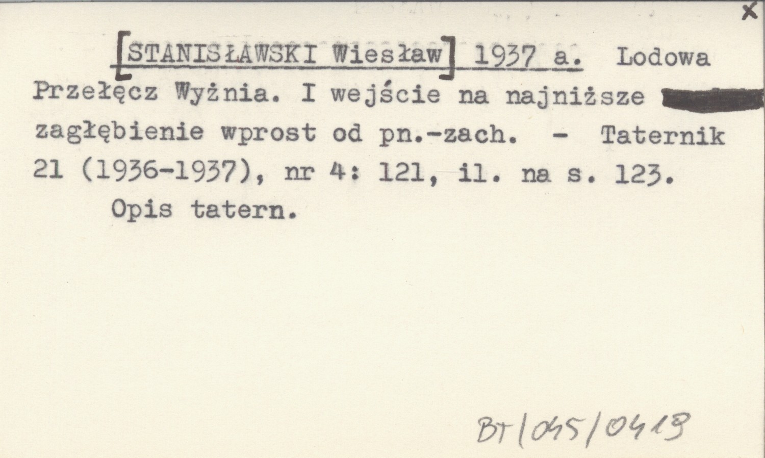 [STANISŁAWSKI Wiesław] 1937 a Lodowa Przełęcz Wyżnia. I wejście na najniższe zagłębienie wprost od pn.-zach.