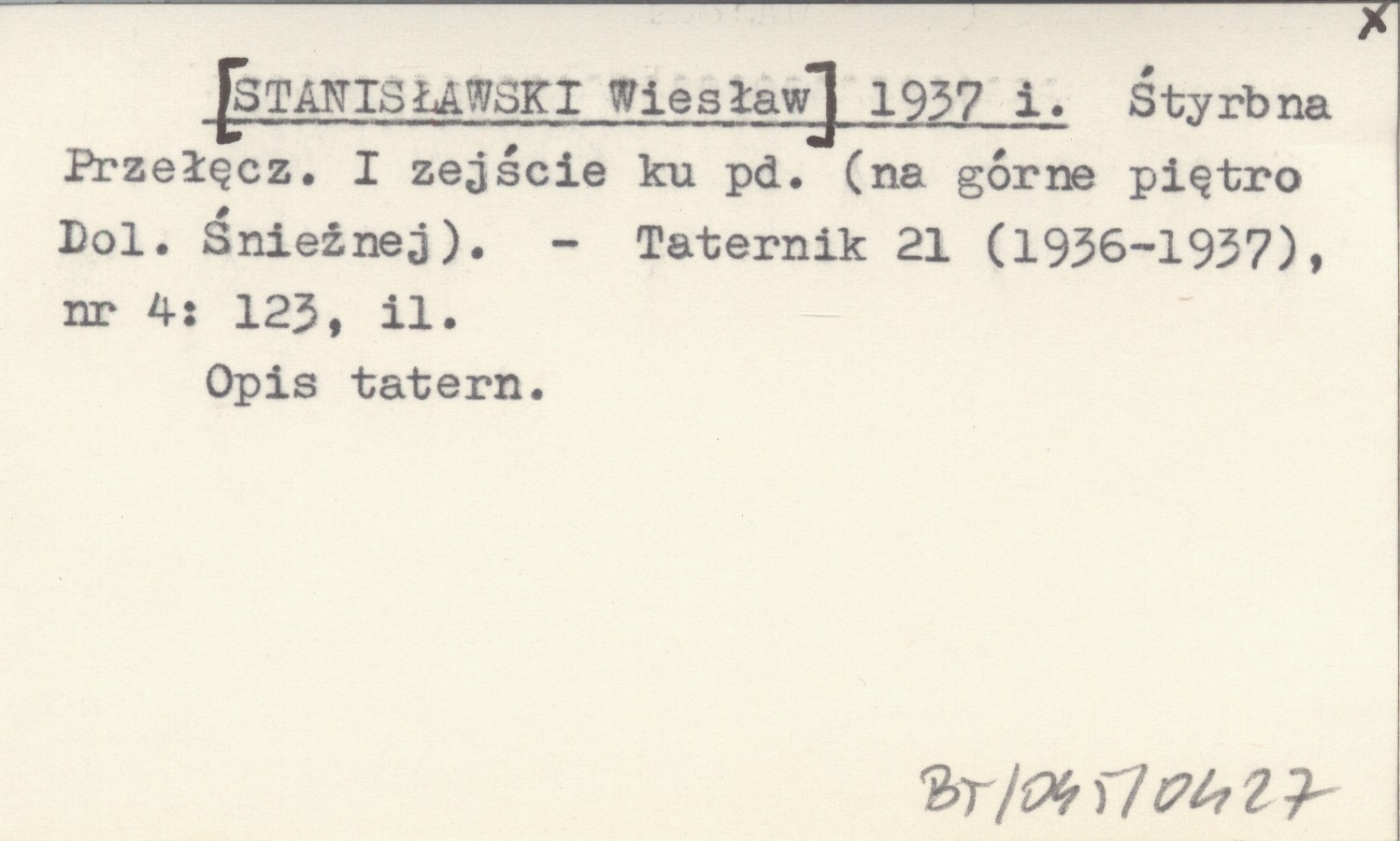 [STANISŁAWSKI Wiesław] 1937 i Śtyrbna Przełęcz. I zejście ku pd. (na górne piętro Dol. Śnieżnej).