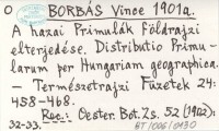 BORBÁS Vince 1901 a A hazai Primulák földrajzi elterjedése. Distributio Primularum per Hungariam geographica.