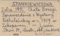 STANKIEWICZOWA Zofia 1911 Chata Brzegi. Sprawozdanie z Wystawy Podhalańskiej w r. 1909 w Zakopanem.