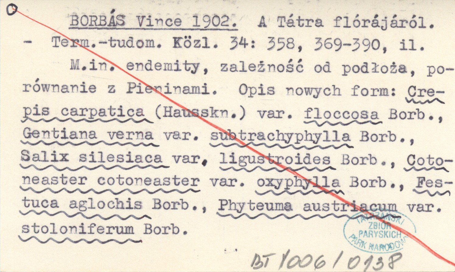 Természet-tudományi Közlöny, 34: 358, 369-390, il. M. in. endemity, zależność od podłoża, porównanie z Pieninami. Opis nowych form: Crepis carpatica (Hausskn.) var. floccosa Borb., Gentiana verna var. subtrachyphylla Borb., Salix silesiaca var. ligustroides Borb., Cotoneaster cotoneaster var. oxyphylla Borb., Festuca aglochis Borb., Phyteuma austriacum var. stoloniferum Borb.