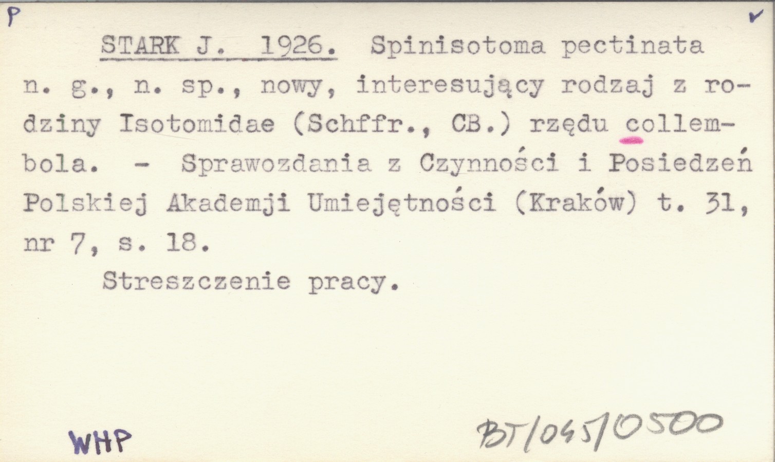 STARK J. 1926 Spinisotoma pectinata n.g., n.sp., nowy, interesujący rodzaj z rodziny Isotomidae (Schffr., CB.) rzędu collembola.