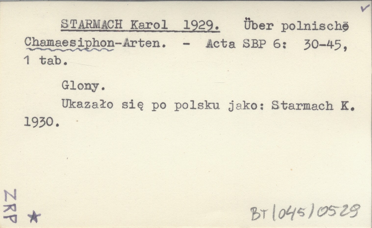 Acta Societatis Botanicorum Poloniae, 6: 30-45, 1 k. Glony. Ukazało się po polsku jako: STARMACH K. 1930.