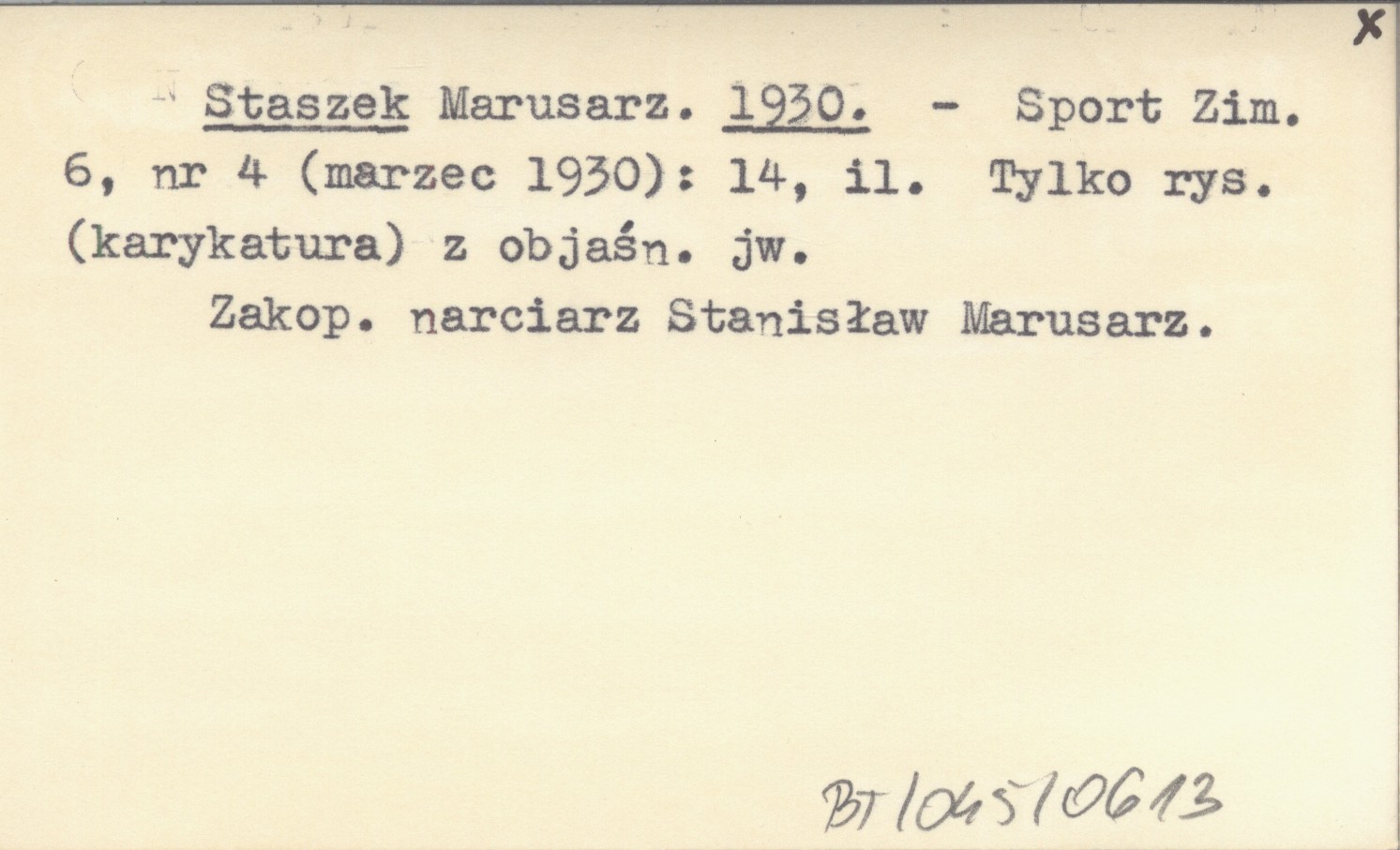 Sport Zimowy, 6, nr 4 (marzec 1930): 14, il. Tylko rysunek (karykatura) z objaśnieniem jw. Zakopiański narciarz Stanisław Marusarz.