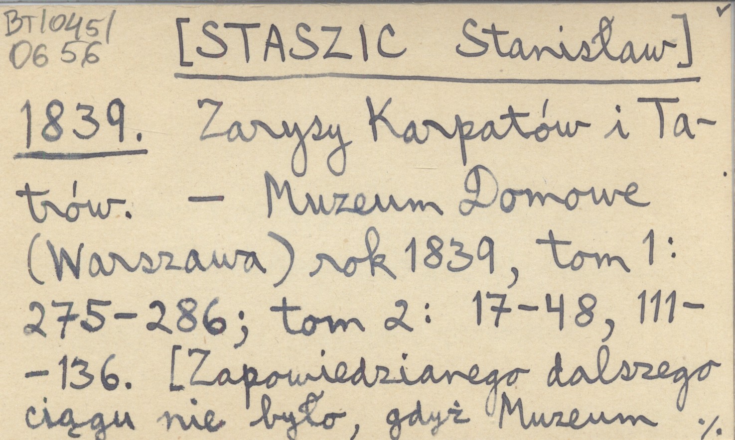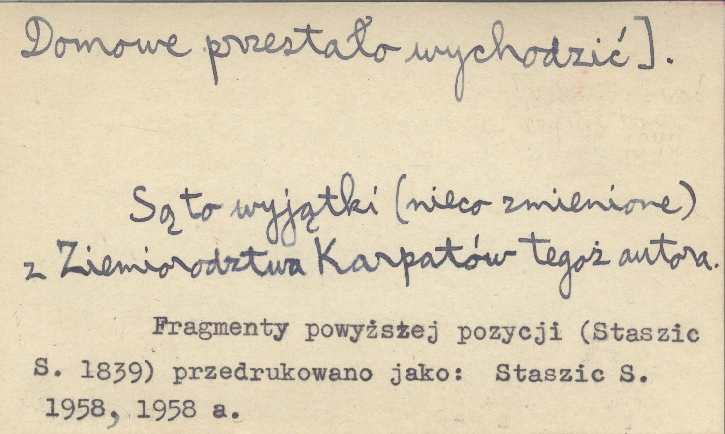 Muzeum Domowe (Warszawa) , T. 1: 275-286 ; t. 2: 17-48, 111-136. Są to wyjątki (nieco zmienione) z Ziemiorodztwa Karpatów tegoż autora. [Zapowiedzianego dalszego ciągu nie było, gdyż Muzeum Domowe przestało wychodzić.] Fragmenty powyższej pozycji (Staszic S. 1839) przedrukowano jako: STASZIC S. 1958, 1958 a.