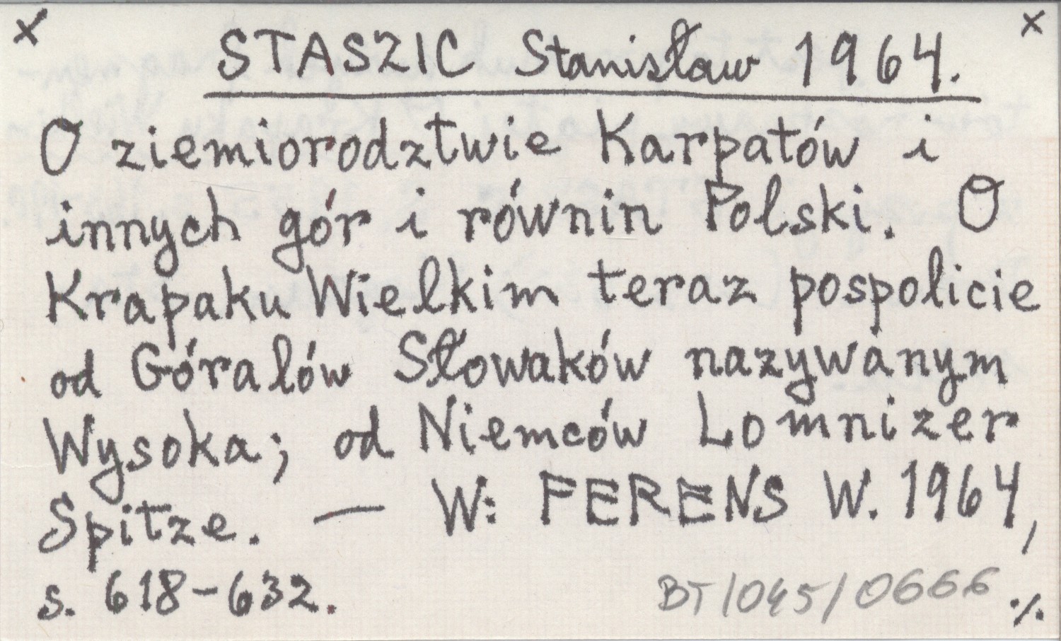 STASZIC Stanisław 1964 O ziemiorodztwie Karpatów i innych gór i równin Polski. O Krapaku Wielkim teraz pospolicie od Góralów Słowaków nazywanym Wysoka ; od Niemców Lomnizer Spitze.