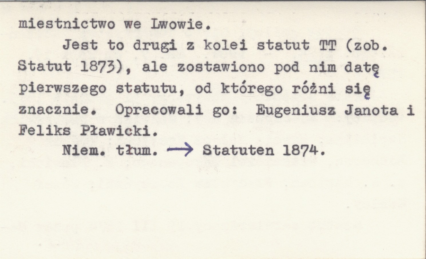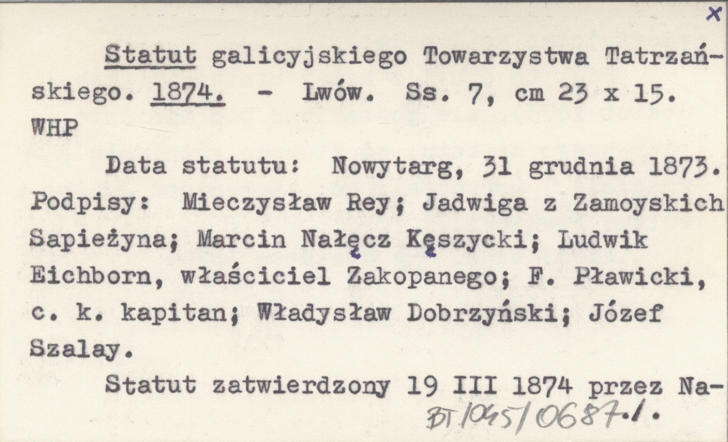 Lwów , 7 s., 23x15 cm. Data statutu: Nowytarg 31 grudnia 1873. Podpisy: Mieczysław Rey, Jadwiga z Zamoyskich Sapieżyna, Marcin Nałęcz Kęszycki, Ludwik Eichborn właściciel Zakopanego, F. Pławicki c.k. kapitan, Władysław Dobrzyński, Józef Szalay. Statut zatwierdzony 19 III 1874 przez Namiestnictwo we Lwowie. Jest to drugi z kolei statut TT (zob. Statut 1873), ale zostawiono pod nim datę pierwszego statutu, od którego różni się znacznie. Opracowali go: Eugeniusz Janota i Feliks Pławicki. Niemieckie tłumaczenie: Statuten 1874.