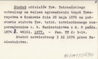 Statut oddziałów Tow. Tatrzańskiego uchwalony na walnem zgromadzeniu tegoż Towarzystwa w Krakowie dnia 28 maja 1876 na podstawie statutu Tow. tatrz. zatwierdzonego rozporządzeniem c.k. Namiestnictwa z d. 8 paźdz. 1874 l. 48161. 1877