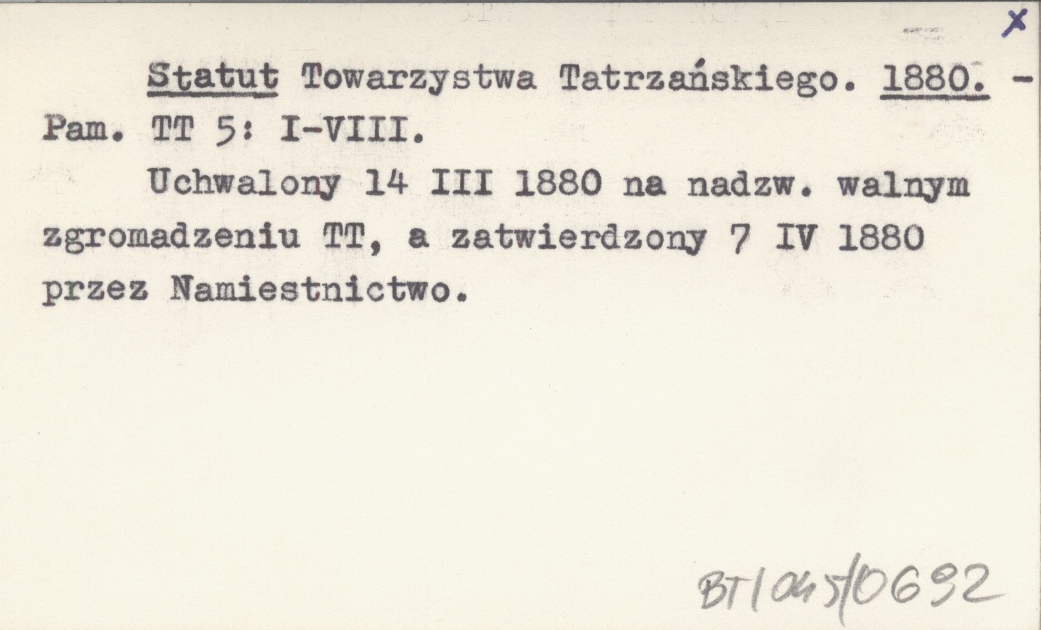 Pamiętnik Towarzystwa Tatrzańskiego, 5: I-VIII. Uchwalony 14 III 1880 na nadzwyczajnym walnym zgromadzeniu TT, a zatwierdzony 7 IV 1880 przez Namiestnictwo.