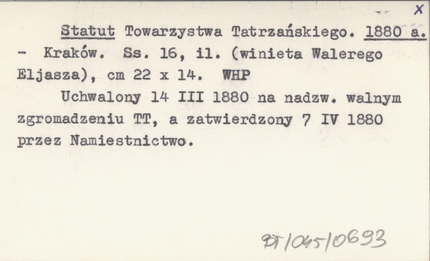Kraków , 16 s., il., 22x14 cm. Uchwalony 14 III 1880 na nadzwyczajnym walnym zgromadzeniu TT, a zatwierdzony 7 IV 1880 przez Namiestnictwo. Winieta Walerego Eljasza.