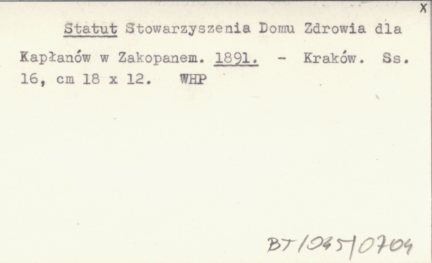 Statut Stowarzyszenia Domu Zdrowia dla Kapłanów w Zakopanem. 1891