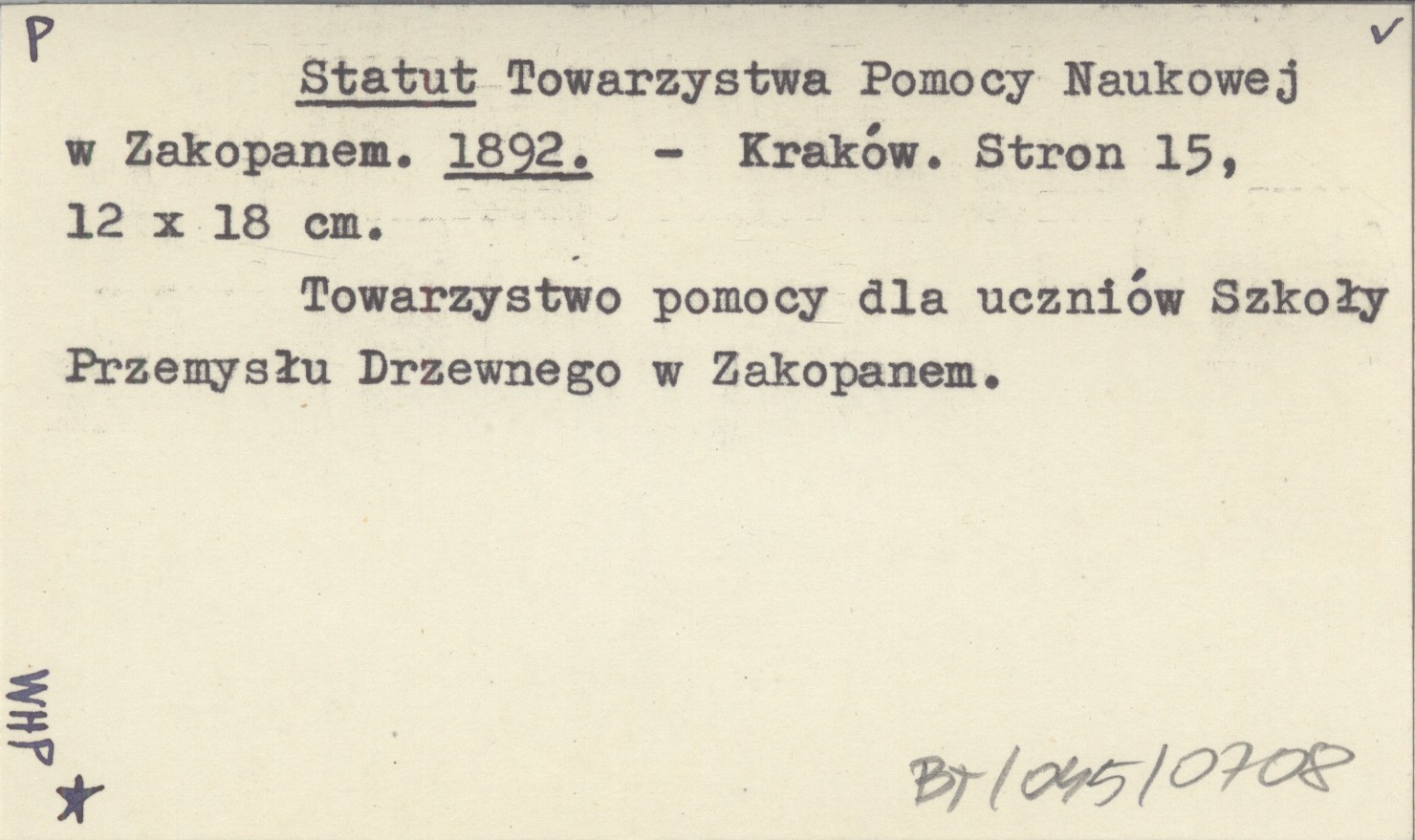 Statut Towarzystwa Pomocy Naukowej w Zakopanem. 1892
