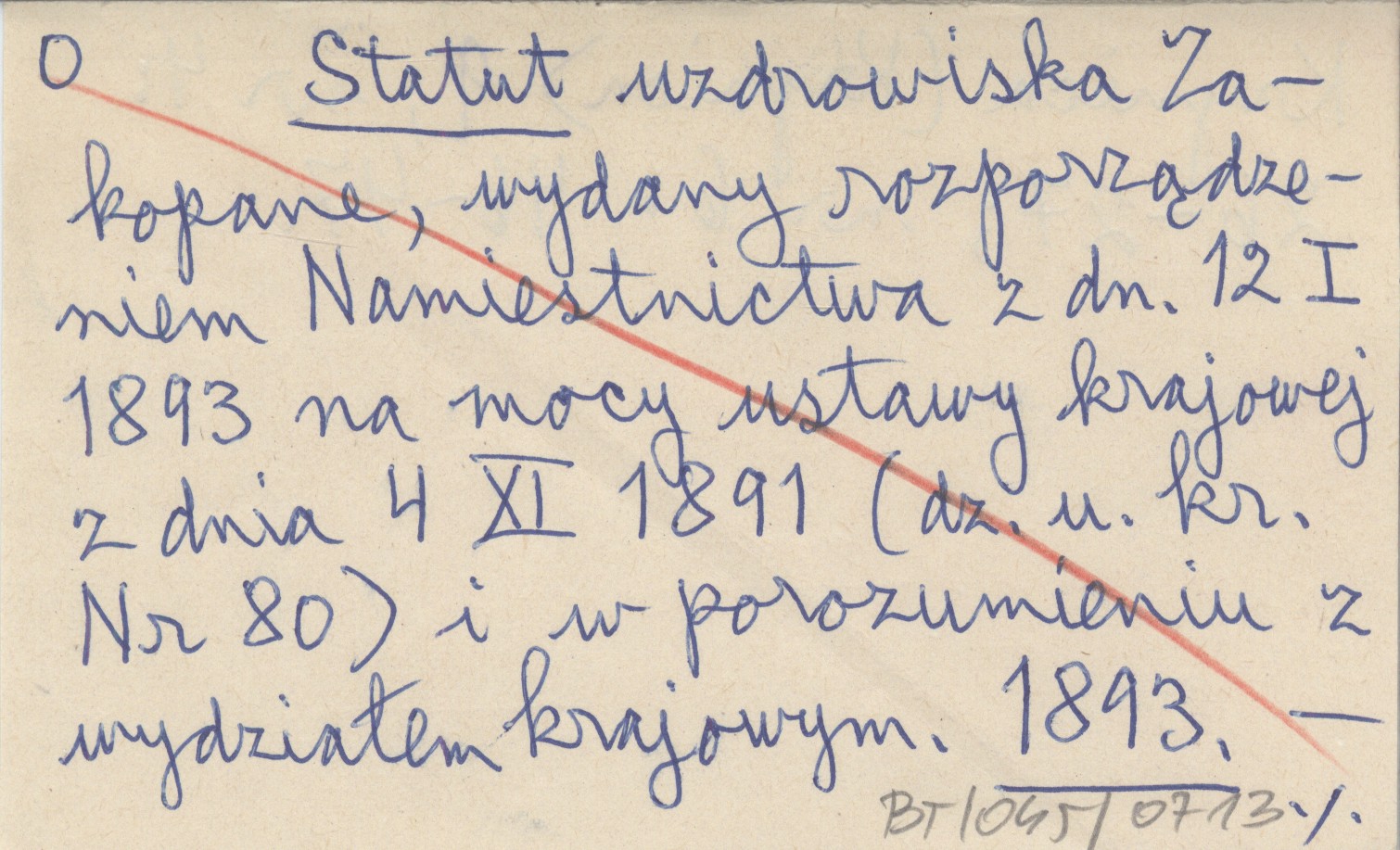 Statut uzdrowiska Zakopane, wydany rozporządzeniem Namiestnictwa z dn. 12 I 1893 na mocy ustawy krajowej z dnia 4 XI 1891 (dz. u. kr. Nr 80) i w porozumieniu z wydziałem krajowym. 1893