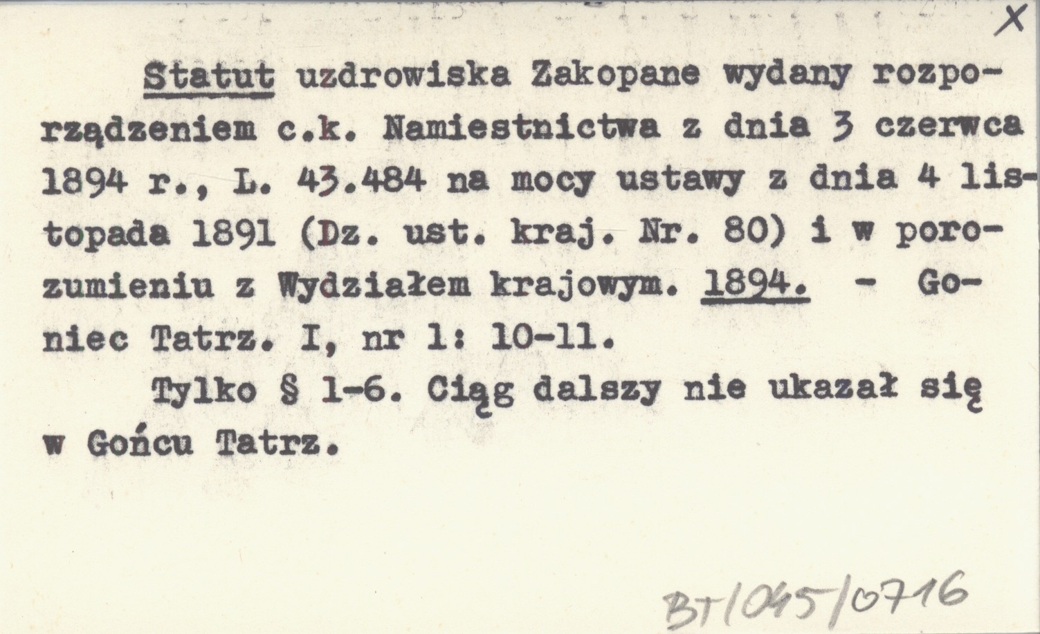 Statut uzdrowiska Zakopane wydany rozporządzeniem c.k. Namiestnictwa z dnia 3 czerwca 1894 r., L. 43.484 na mocy ustawy z dnia 4 listopada 1891 (Dz. ust. kraj. Nr 80) i w porozumieniu z Wydziałem krajowym. 1894