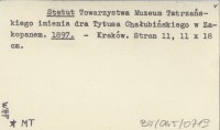 Statut Towarzystwa Muzeum Tatrzańskiego imienia dra Tytusa Chałubińskiego w Zakopanem. 1897