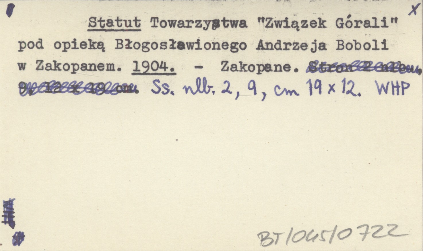 Statut Towarzystwa "Związek Górali" pod opieką Błogosławionego Andrzeja Boboli w Zakopanem. 1904