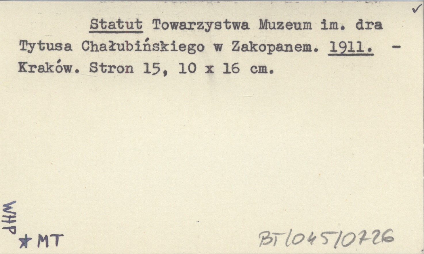 Statut Towarzystwa Muzeum im. dra Tytusa Chałubińskiego w Zakopanem. 1911