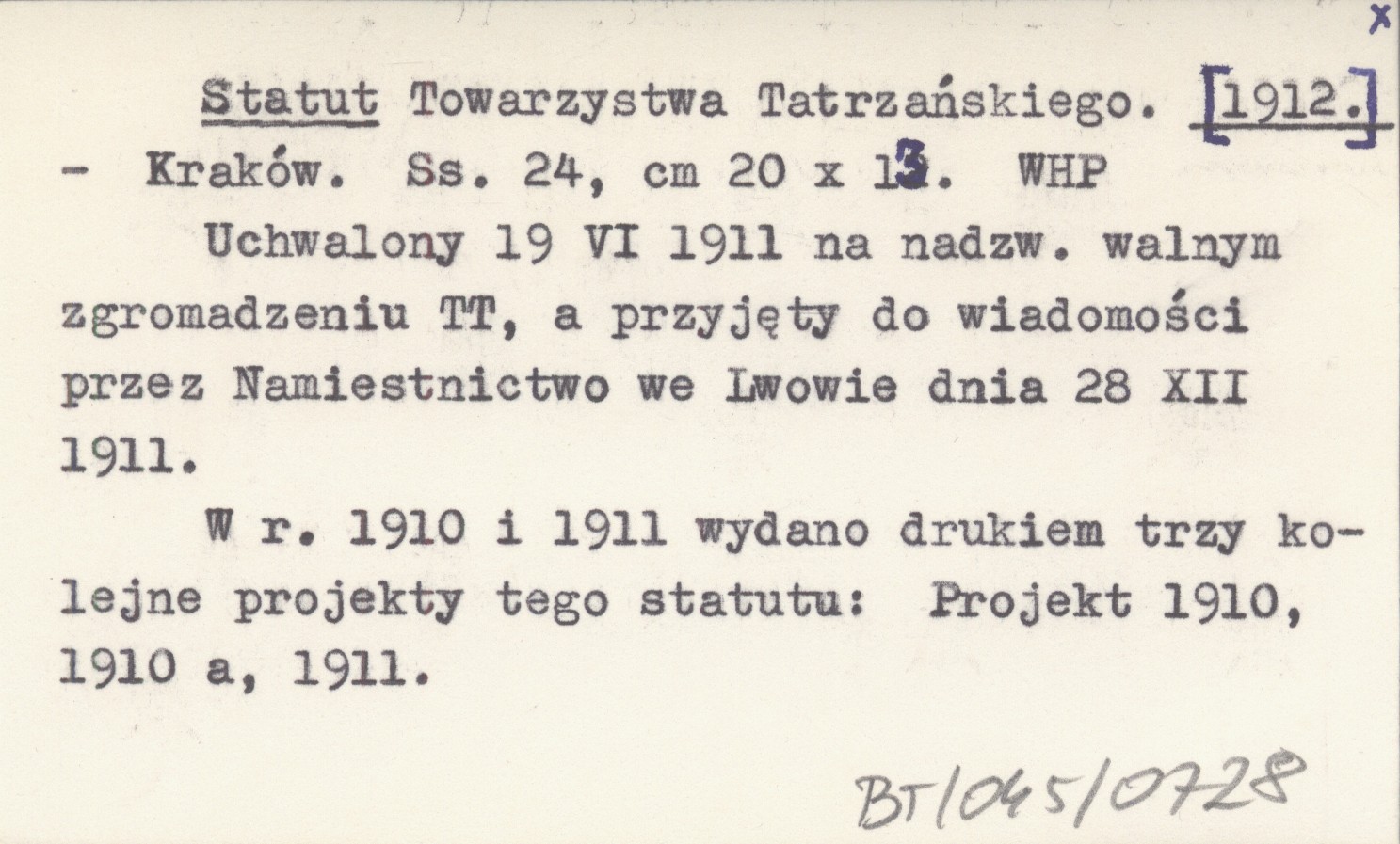 Kraków , 24 s., 20x13 cm. Uchwalony 19 VI 1911 na nadzwyczajnym walnym zgromadzeniu TT, a przyjęty do wiadomości przez Namiestnictwo we Lwowie dnia 28 XII 1911. W r. 1910 i 1911 wydano drukiem trzy kolejne projekty tego statutu: Projekt 1910, 1910 a, 1911.