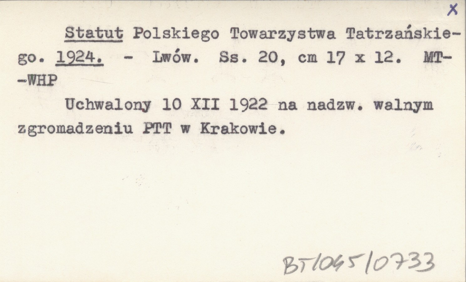Lwów , 20 s., 17x12 cm. Uchwalony 10 XII 1922 na nadzwyczajnym walnym zgromadzeniu PTT w Krakowie.