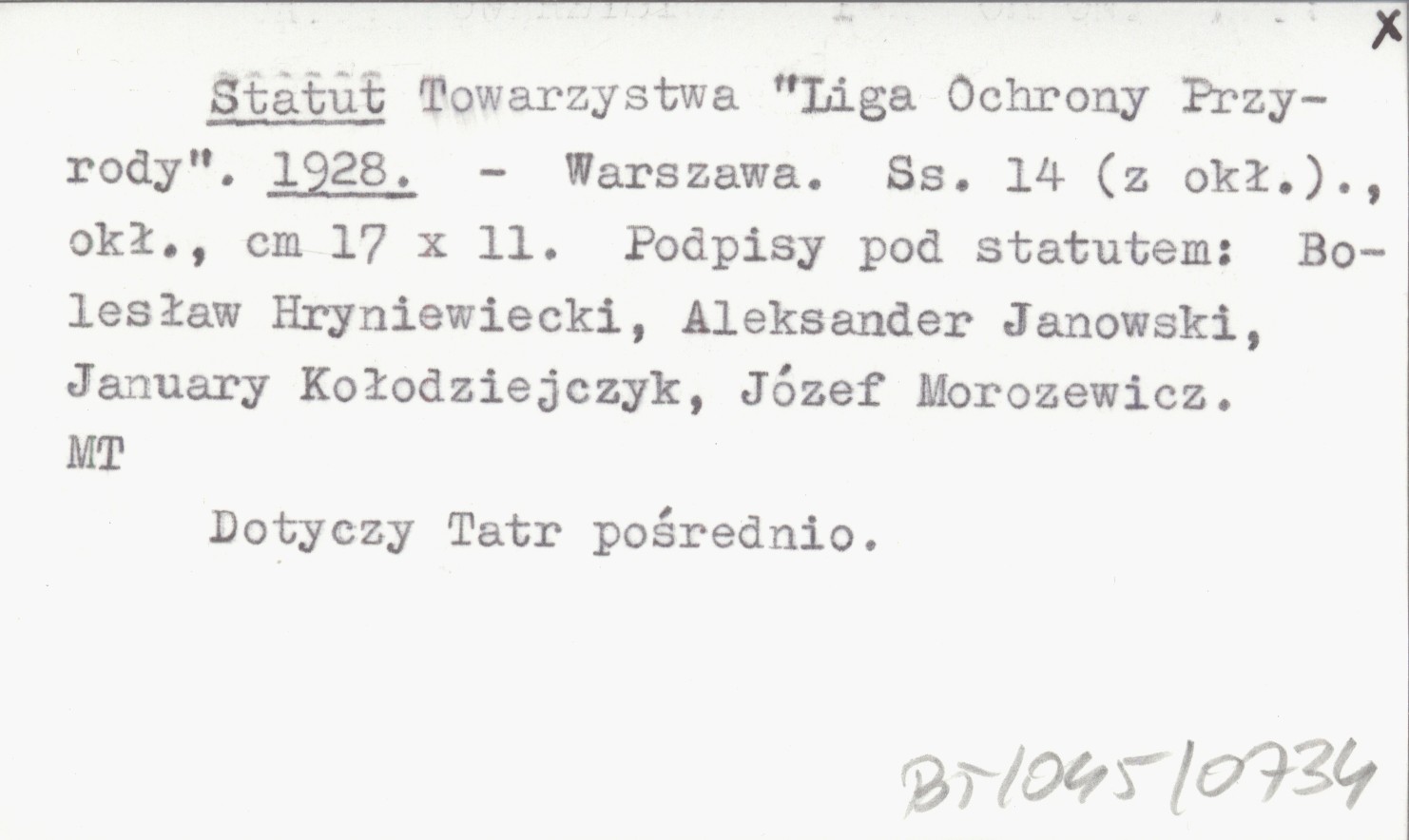 Warszawa , 14 s., okł., 17x11 cm. Podpisy pod statutem: Bolesław Hryniewicki, Aleksander Janowski, January Kołodziejczyk, Józef Morozewicz. Dotyczy Tatr pośrednio.