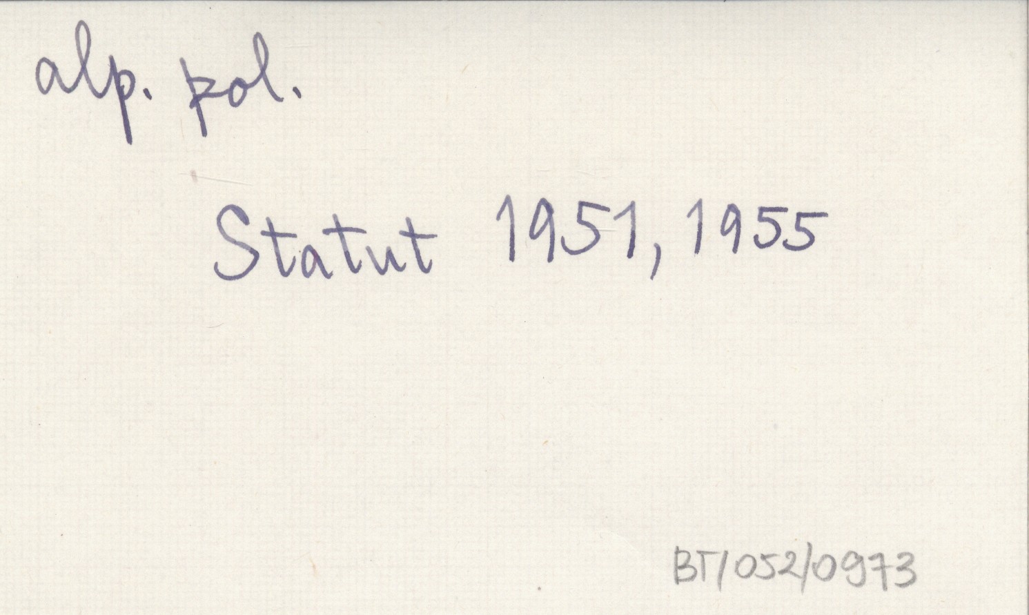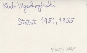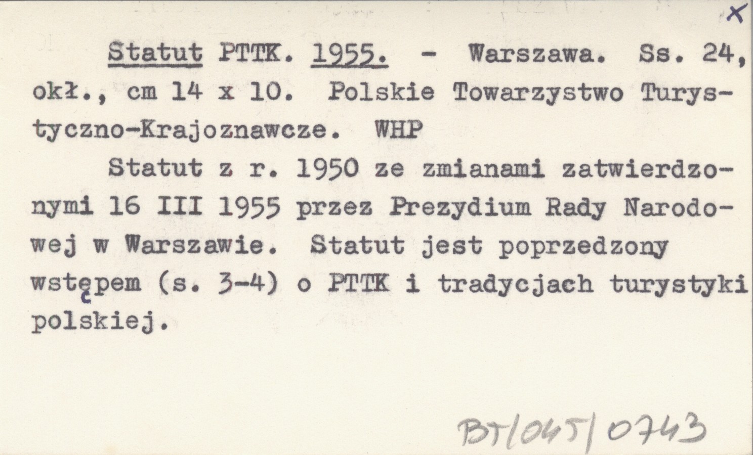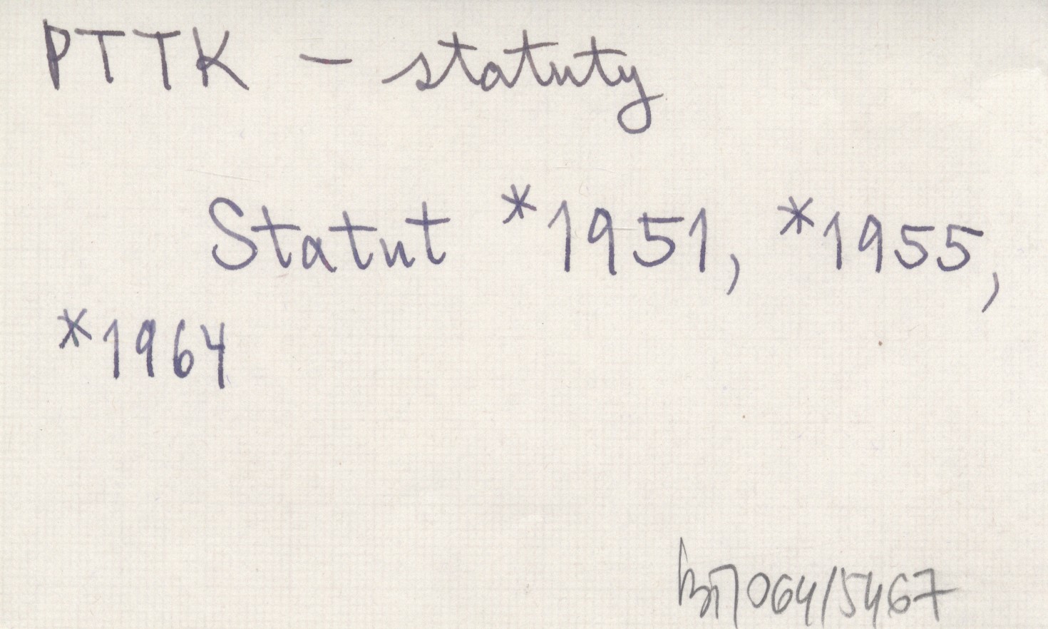 Warszawa , 24 s., okł., 14x10 cm. Polskie Towarzystwo Turystyczno-Krajoznawcze. Statut z r. 1950 ze zmianami zatwierdzonymi 16 III 1955 przez Prezydium Rady Narodowej w Warszawie. Statut jest poprzedzony wstępem (s. 3-4) o PTTK i tradycjach turystyki polskiej.