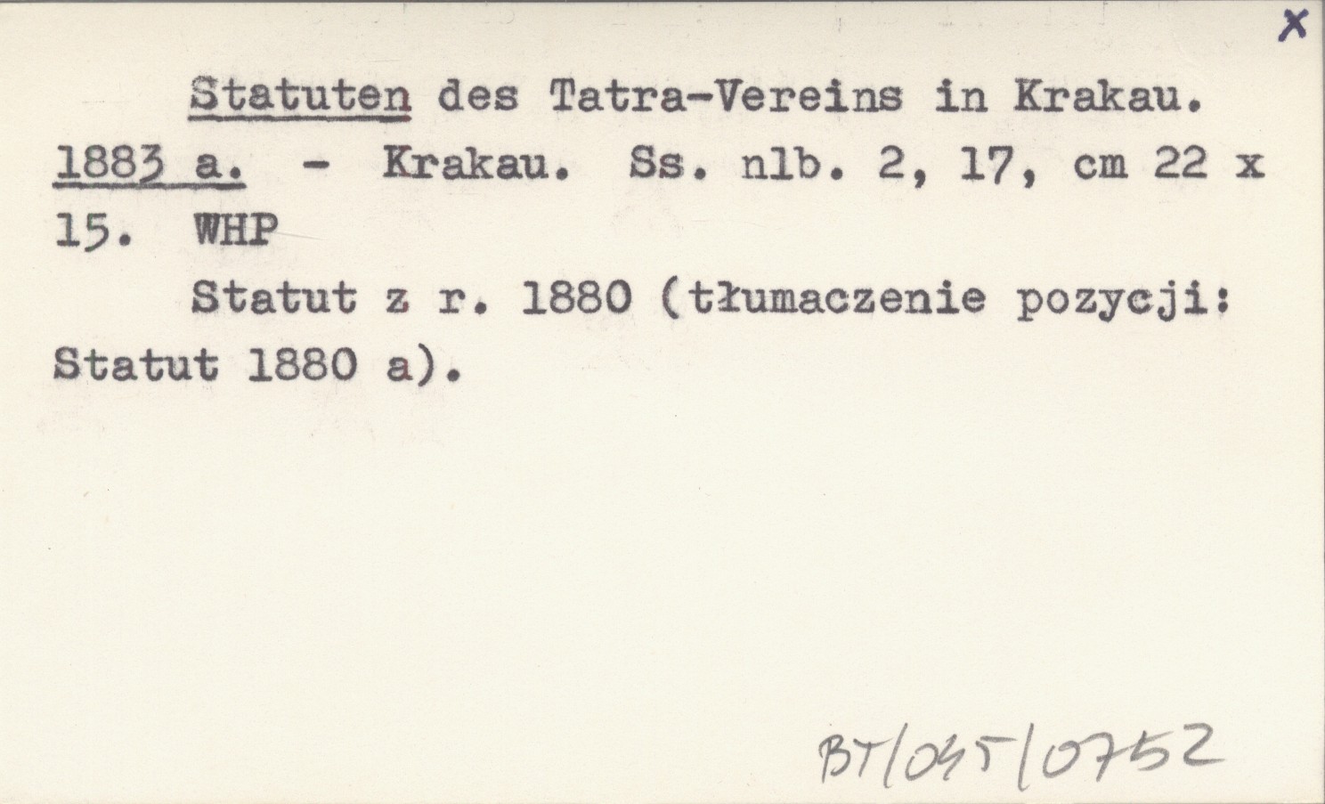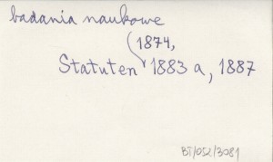 Krakau , [2], 17 s., 22x15 cm. Statut z r. 1880 (tłumaczenie pozycji: Statut 1880 a).