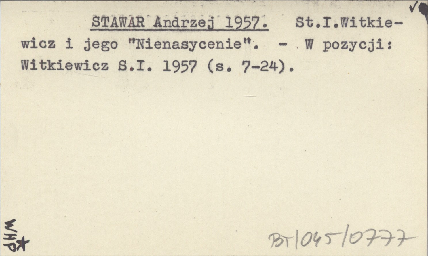 STAWAR Andrzej 1957 St. I. Witkiewicz i jego "Nienasycenie".