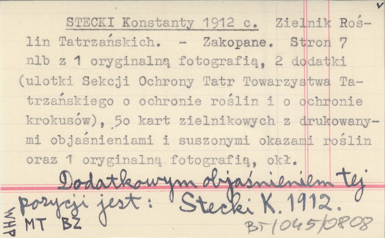Zakopane , [7] s., 50 k., okł. 2 dodatki (ulotki Sekcji Ochrony Tatr Towarzystwa Tatrzańskiego o ochronie roślin i o ochronie krokusów. Karty zielnikowe z drukowanymi objaśnieniami i suszonymi okazami roślin. Dodatkowym objaśnieniem tej pozycji jest: STECKI K. 1912.